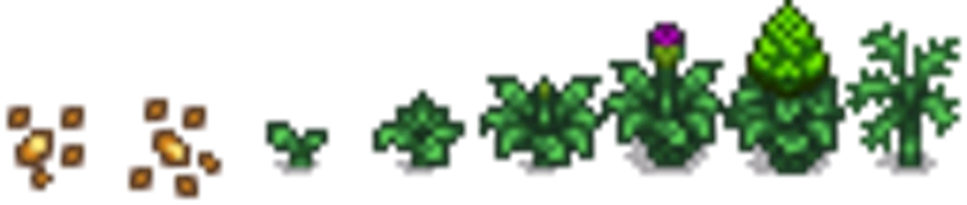 Artichokes are crops in Stardew Valley. They can be grown during the Fall and take 8 days to mature. They sell through the shipping container for No Star: 160g, Silver: 200g, Gold: 240g each.