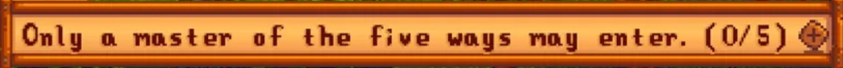 You will see the warning, "Only a master of the five ways may enter," along with a number that indicates where you are in the journey—for example, 1/5 or 2/5—if you attempt to interact with this door before you have reached your maximum level across the five skills.