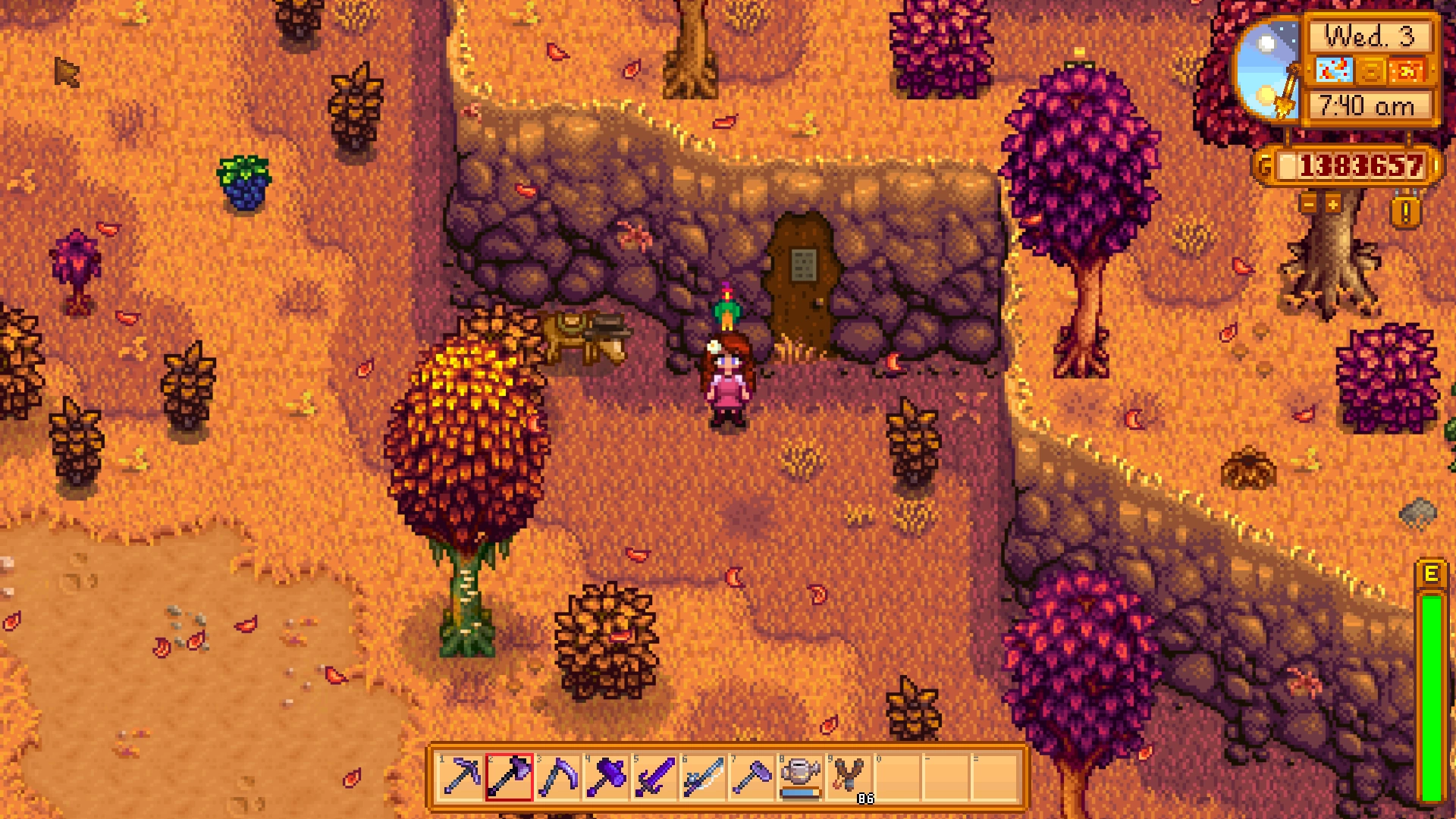 Mastery Cave is a small cave located in the Cindersap Forest and is accessible after the player has reach level 10 in all skill trees. It's a secret door with a sign on the front is situated just below Leah’s Cottage, nestled into the hillside.