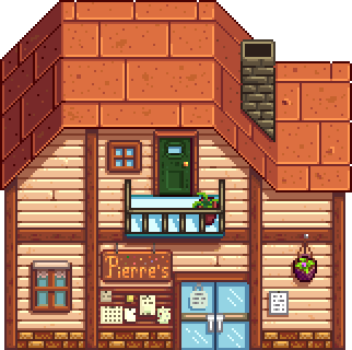 The produce and food store of the town, this shop sells produce, flower and tree seeds, basic food supplies (Rice, Oil, Flour, Sugar and Vinegar), wallpaper, flooring, fertilizer and bouquets (which is needed to date your potential partner).